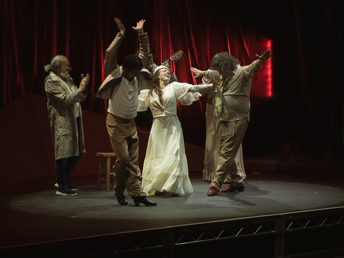 Images from "Songs from a Sinking Ship." From left, PHOTO 1: Juan José Amador, Carlos Menchaca, Marina Elana and El Torombo. Photo by Fred Aube, FAI. PHOTO 2: Carlos Menchaca, Marina Elana and El Torombo. Photo by Planet Froth Productions, FAI