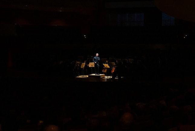 Members of the Pacific Chorale sing part of the concert from high in the balcony, behind the audience. In a dramatic moment, Shelley conducts from a single spotlight during the performance. Photo courtesy of Pacific Symphony/Doug Gifford