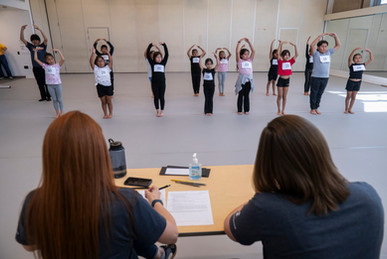 PHOTO 1: Instructor Maya Mozon, right, directs kids into a practice hall for part of their audition. PHOTO 2: An aspiring student waits for instructions as she prepares to audition. PHOTO 3: Maya Mozon, right, an instructor for The Wooden Floor, encourages prospective students as they prepare for their audition. PHOTO 4: Student practice the proper way to point their toes. PHOTO 5: An aspiring student waits for instructions. PHOTO 6: Aspiring students are evaluated by The Wooden Floor instructors during their audition.